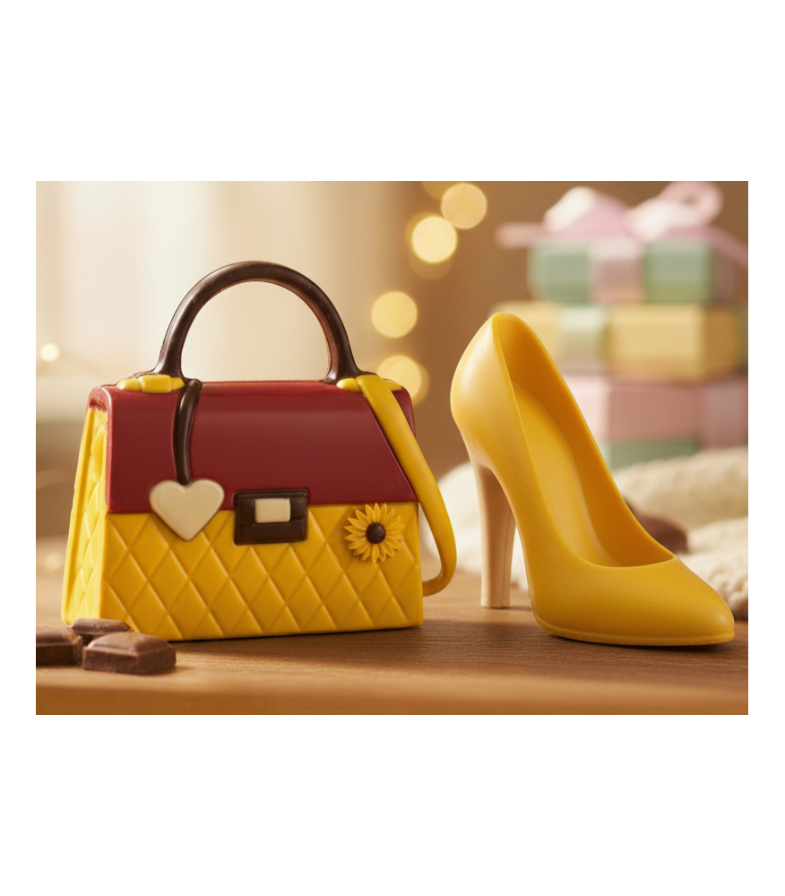 ČOKOLÁDOVÝ SET (ČRIEVIČKA a KABELKA) "SUNNY" je vyrobený z bielej belgickej čokolády.